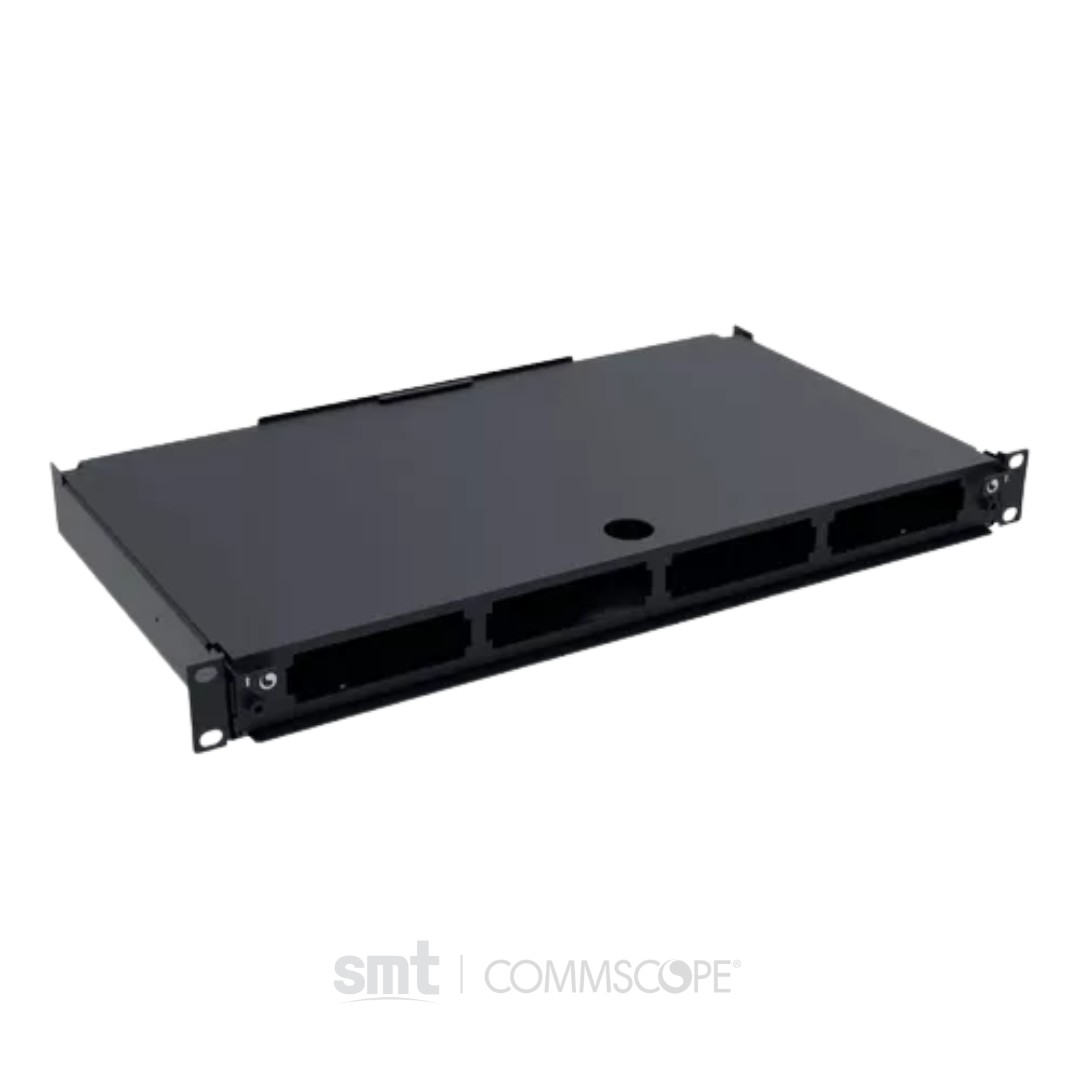 Es un panel deslizable de 1U de la marca CommScope, diseñado para alojar hasta cuatro módulos G2 o paquetes de adaptadores, proporcionando hasta 48 puertos LC dúplex o 32 puertos MPO.