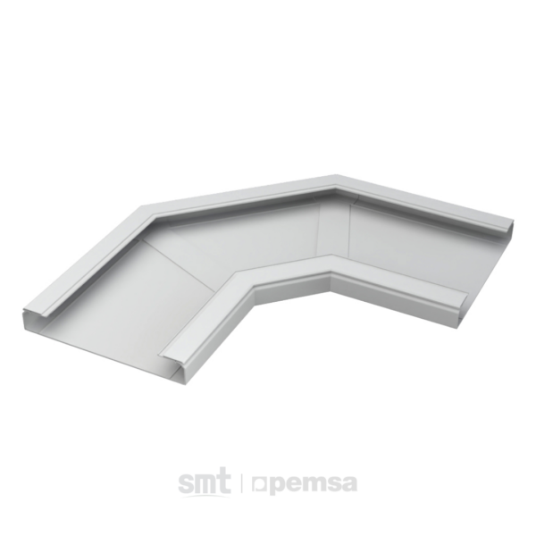 Accesorio aislante para conducción de cables en ángulo 90° para bandejas y canales protectoras Metatray® . Fabricada en material termoplástico aislante en base de PVC. Color gris RAL 7035, para conducción para el soporte, protección y conducción de cables.