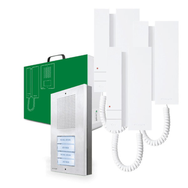 El kit comprende: tres telefonillos de la serie Mini art. 2702W, un transformador art. 1200 y una placa externa preparada para 2/4 pulsadores de llamada de la serie EXTRA art. ET5100 y 4 pulsadores individuales para placa externa Extra art. ET9211. El kit se puede ampliar con otro telefonillo para cada usuario. La placa externa se puede instalar de superficie o de empotrar con los correspondientes accesorios suministrados con el kit.