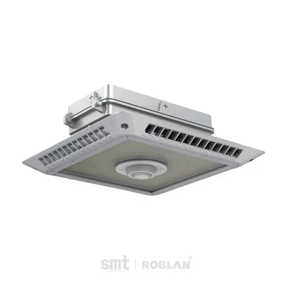 Luminaria LED para estaciones de servicio con sensor de movimiento, certificación ATEX/IECEx, alto ahorro energético, resistente a ambientes corrosivos y explosivos, ideal para zonas industriales y comerciales.