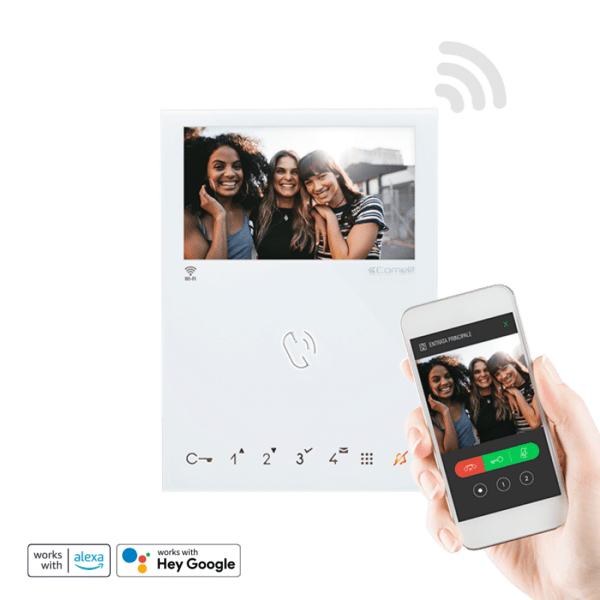 Monitor serie Mini manos libres Wi-Fi para sistema Simplebus 2. Asociado a la aplicación Comelit, que se puede descargar gratuitamente en App Store o Google Play, o a los asistentes de voz Alexa/Ecoshow/Asistente de Google, permite responder a las llamadas directamente desde el smartphone/tablet/asistentes por voz, tanto en modo local como remoto. Permite habilitar la función “Reconocimiento facial”, directamente desde la aplicación, para enviar automáticamente, tras reconocer a una persona, el mando abrepuertas (activado por defecto), accionar un actuador para controlar una luz o una apertura adicional y recibir una notificación cuando una persona conocida realiza una llamada.