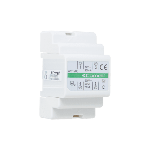 Transformador con entrada de 230VAC y salida de 12VAC/900 mA. Dimensiones: 53x95x65 mm (3 módulos DIN).
