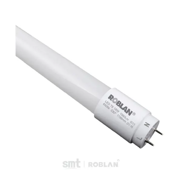 Tubo LED LLT81200B Roblan (18W, 1200mm). Reemplazo fácil y seguro para tubos fluorescentes tradicionales. Ofrece 1980 lúmenes en luz Blanco (6500K) con un ángulo de 330°. Cuenta con Certificado NSF para la industria alimentaria y revestimiento anti-estallido (Shatter proof). Ideal para aplicaciones donde la seguridad y la higiene son prioritarias.